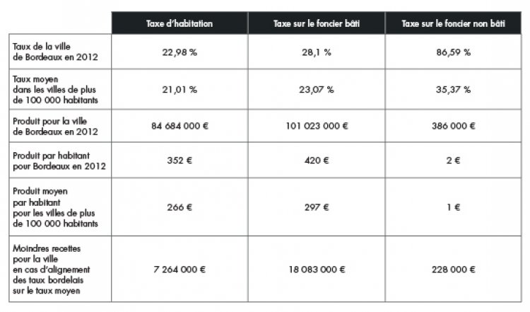 Les recettes de la ville de Bordeaux ont fortement augmenté au cours des deux dernières mandatures (+5 % par an entre 2002 et 2012), tirées notamment par la progression des ressources fiscales (+37 %). Cette dynamique s’explique par la croissance de la population et la richesse relative de ses habitants, qui fait bénéficier la ville de bases fiscales élevées et en forte progression. Les taux des impôts locaux ont été maintenus à un niveau élevé par rapport aux autres grandes villes comparables.