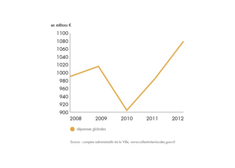 Les dépenses de Nantes-Métropole ont globalement augmenté depuis 2008, tirées par les dépenses de fonctionnement, passées de 990 M€ en 2008 à 1 079 M€ en 2012.