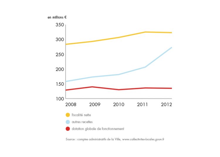 Depuis 2008, la dotation globale de fonctionnement a été plutôt stable et la fiscalité nette a cru faiblement, présentant même une faible décroissance en 2012. Ainsi, la croissance des recettes de la collectivité a été presque complètement tirée par la croissance des autres recettes.