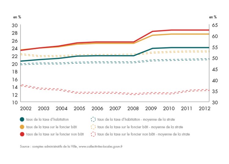 En effet, le conseil municipal a voté à deux reprises, en 2009 et en 2010, des augmentations des taux : +2 points pour la taxe d’habitation (TH) et la taxe foncière sur les propriétés bâties (TFPB) et +5,4 points pour la taxe foncière sur les propriétés non bâties (TFPNB).