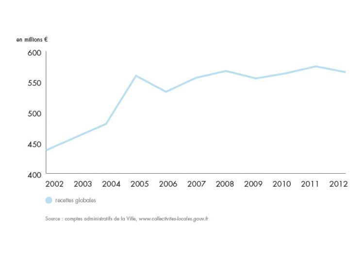 Les recettes de fonctionnement de la ville de Nantes ont augmenté de façon continue sur la période 2002-2012, avec un palier en 2009 et un autre en 2012. Cependant, les recettes par habitant de Nantes sont plus dynamiques que celles des villes comparables sur la période 2002-2009, mais moins sur la période récente (2010-2012).