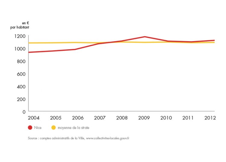 Les marges de manœuvre de la ville pour financer ses investissements sont cependant contraintes. Rapportée à la population, la capacité d’autofinancement de la ville de Nice s’avère cependant plus faible et le recours à l’emprunt plus important que dans les autres communes de la strate. En 2012, la capacité d’autofinancement était ainsi de 147 € par habitant à Nice, soit 20 % de moins que la moyenne de la strate (184 € par habitant). Inversement, le recours annuel à l’emprunt en euros par habitant, qui était en 2008 supérieur de 47 % à la moyenne des autres communes de plus de 100 000 habitants, s’en est rapproché sur la dernière mandature. Il s’établit à 131 € par habitant en 2012, soit une valeur légèrement supérieur à la moyenne de la strate (124 €).