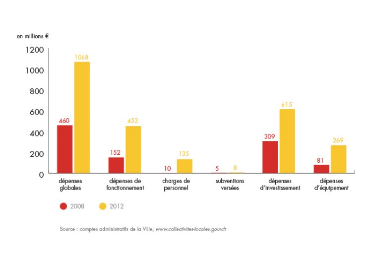 Les dépenses globales de la communauté urbaine ont fortement augmenté entre 2008 et 2012, passant de 460 M€ en 2008 à 1 Md€ en 2012, soit une augmentation de 132 %.